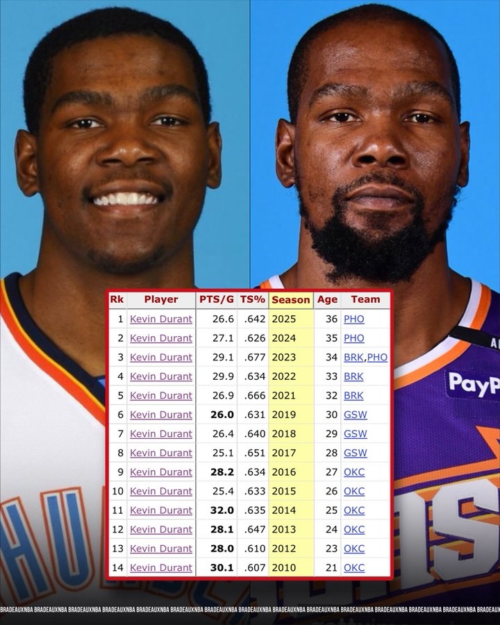 杜兰特生涯至今14个赛季做到场均得分25+且真实命中率至少60%,次数高居历史第一,而且目前他连续13个赛季做到。